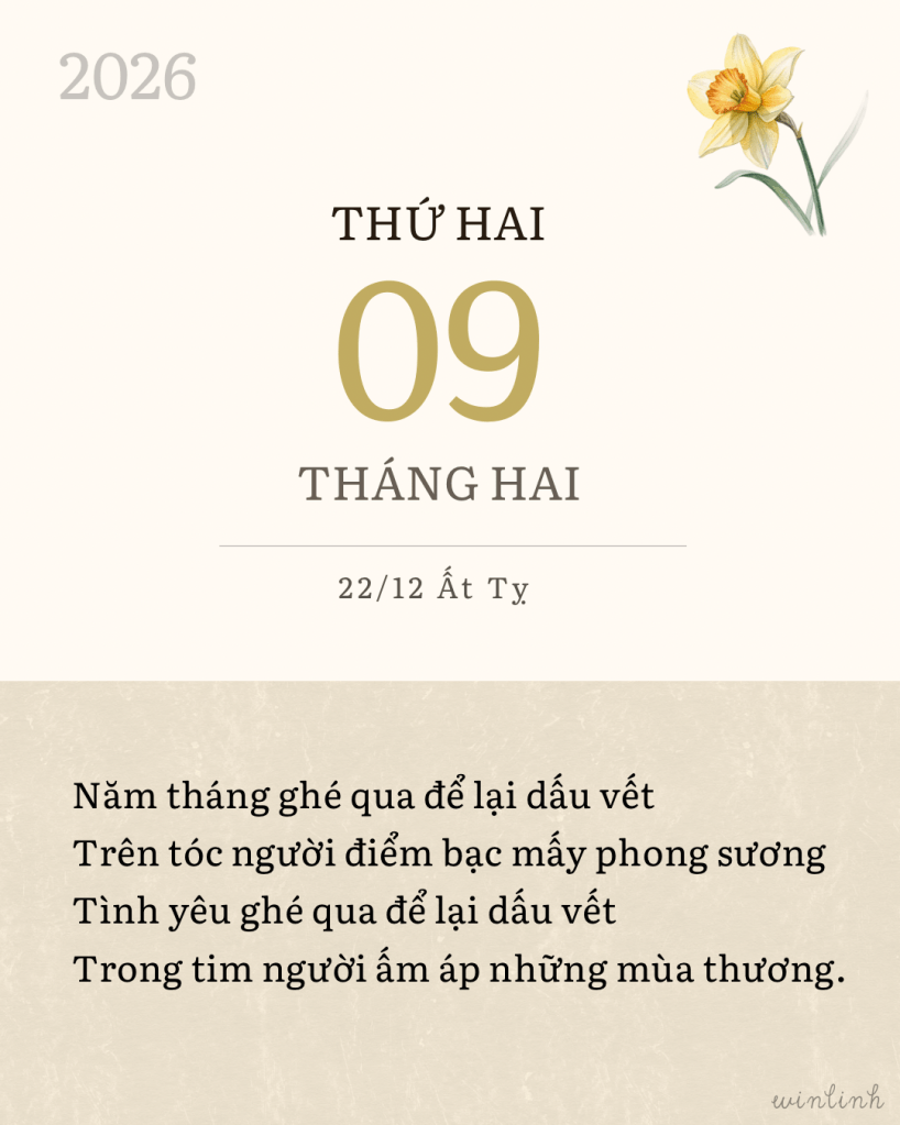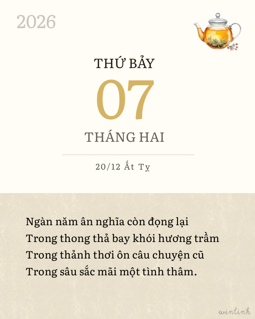 E ấp nụ đào hé cánh tiên Thời gian nhẹ bước đến rất hiền Tôi rót trà thơm chào xuân tới Xin trời cho hai chữ Bình Yên Mưa bụi giăng tơ giữa thảnh thơi Thơm tho nở khẽ đóa hoa cười Năm mới thuận duyên mà vui sống Thương người và người cũng thương tôi.