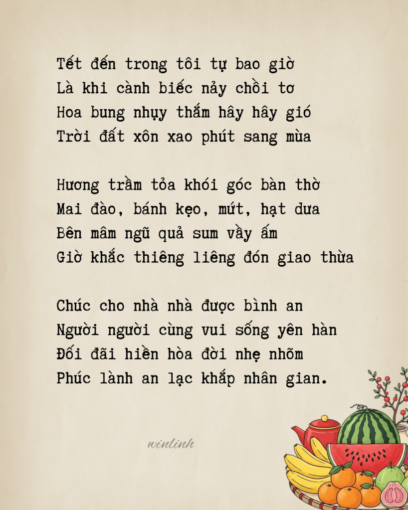 Với tôi, Tết là khoảnh khắc bình yên chứ chẳng phải là những cuộc tụ tập hào nhoáng sôi động. Tết là lúc tôi về với tĩnh lặng lòng mình và ngồi lại bên nhau để cùng tận hưởng hơi ấm tình thân. Tết là lúc ngưng đọng để chiêm nghiệm và ngâm ngợi, để nhận ra đâu là giá trị đích thực trong cuộc sống mà mình cần hướng tới và gìn giữ. Tết là giấc mơ và ước mơ của đời người với những cảm xúc ngọt ngào và hy vọng, chứ không chỉ là chu kỳ bốn mùa đến và đi khô khan.