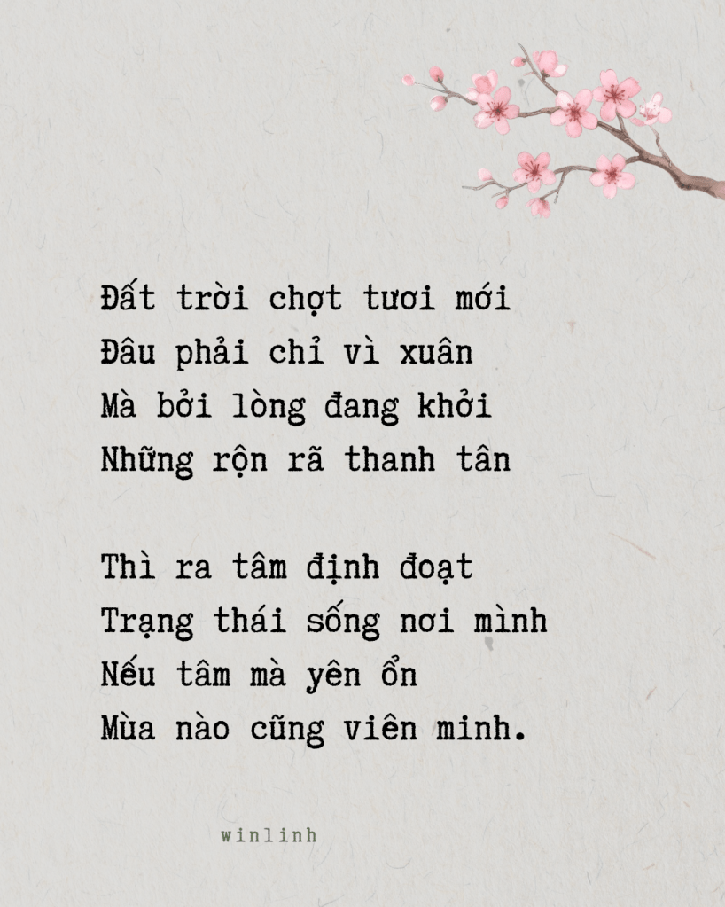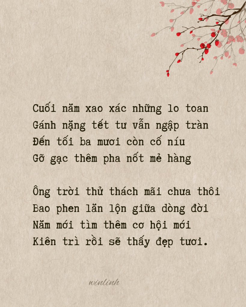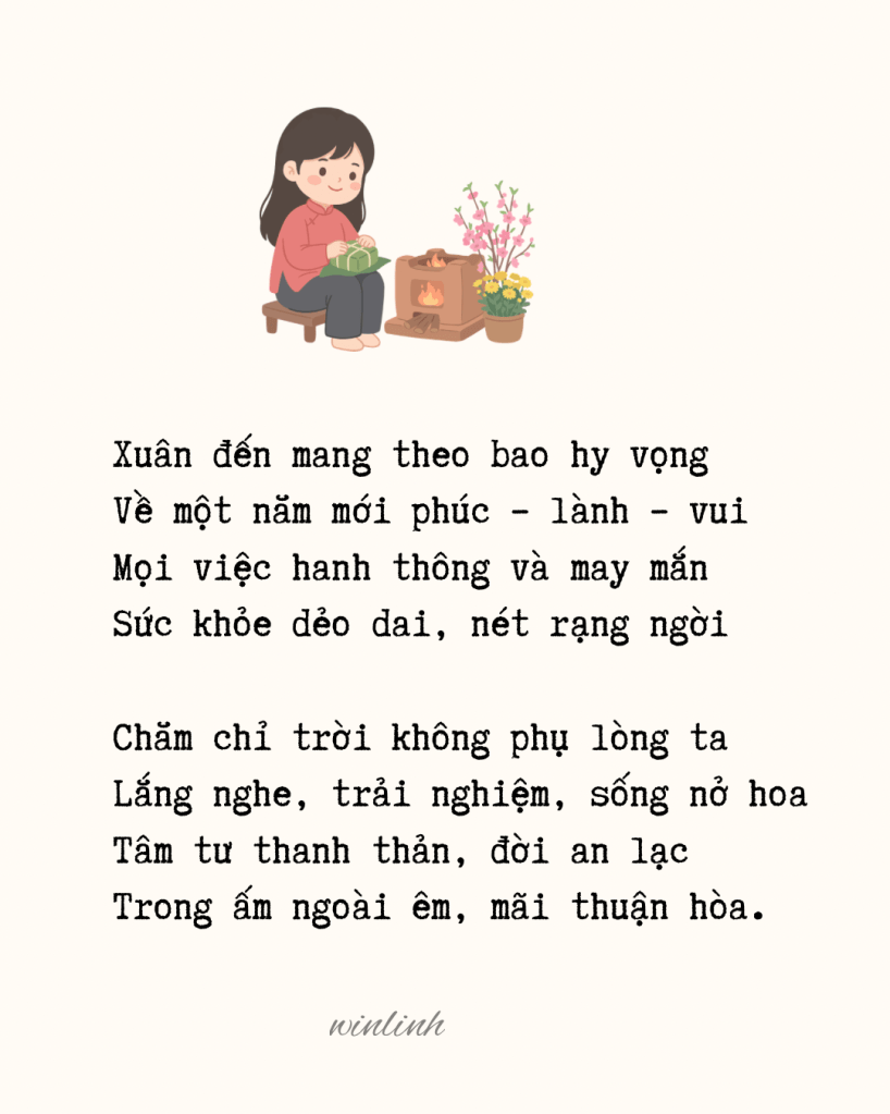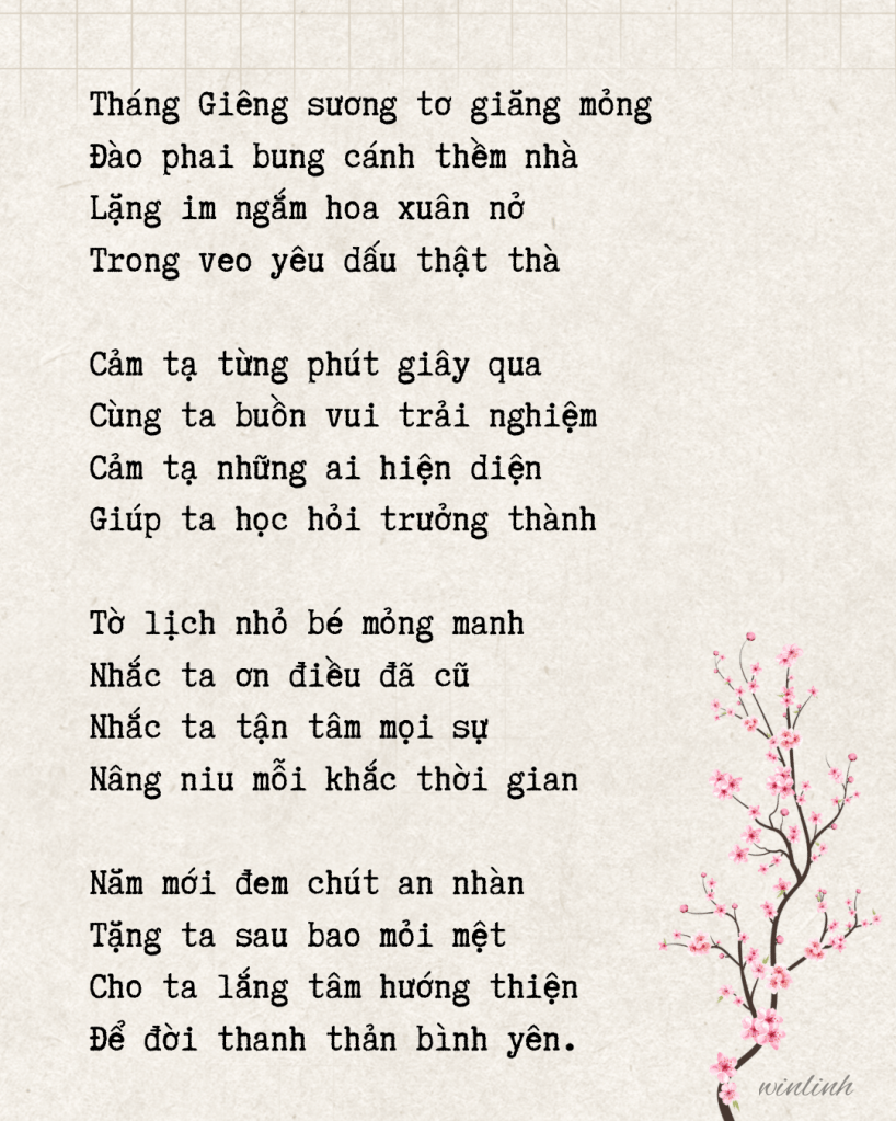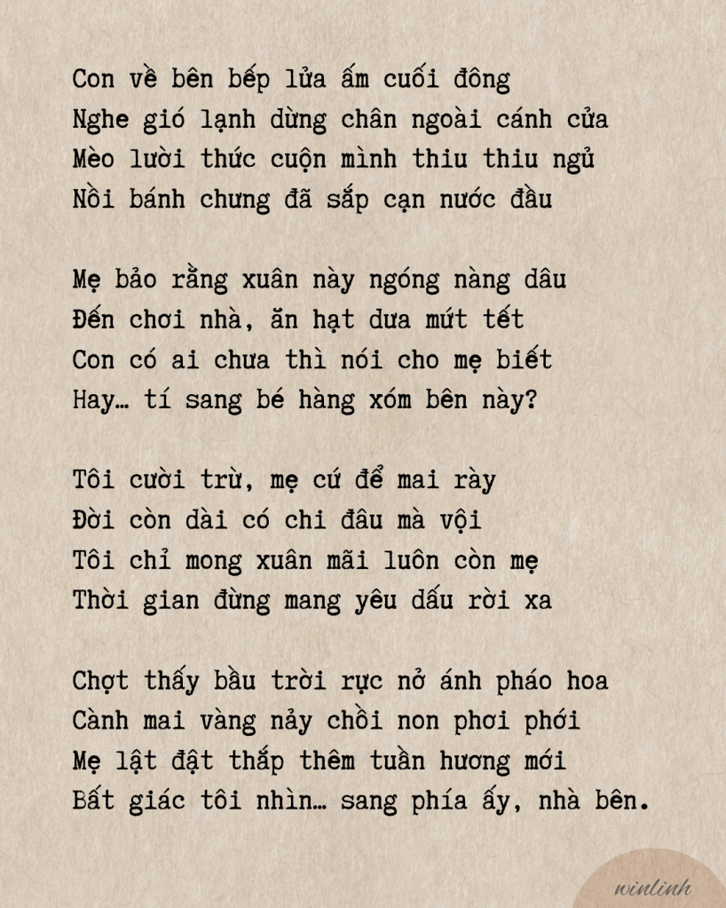 Những bài thơ và tản văn trong “Mùa Tết” sẽ đưa bạn trở về với lắng đọng tâm hồn, với những điều thân thuộc gần gũi mà đôi lúc bạn đã lãng quên; giúp bạn trân trọng hơn tình thân cũng như trân quý hơn cuộc đời mình. Hãy đọc và cảm nhận, Winlinh tin bạn sẽ tìm thấy mình trong những dòng thơ văn mộc mạc ấy!