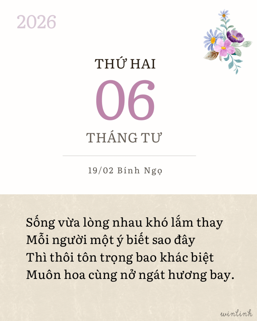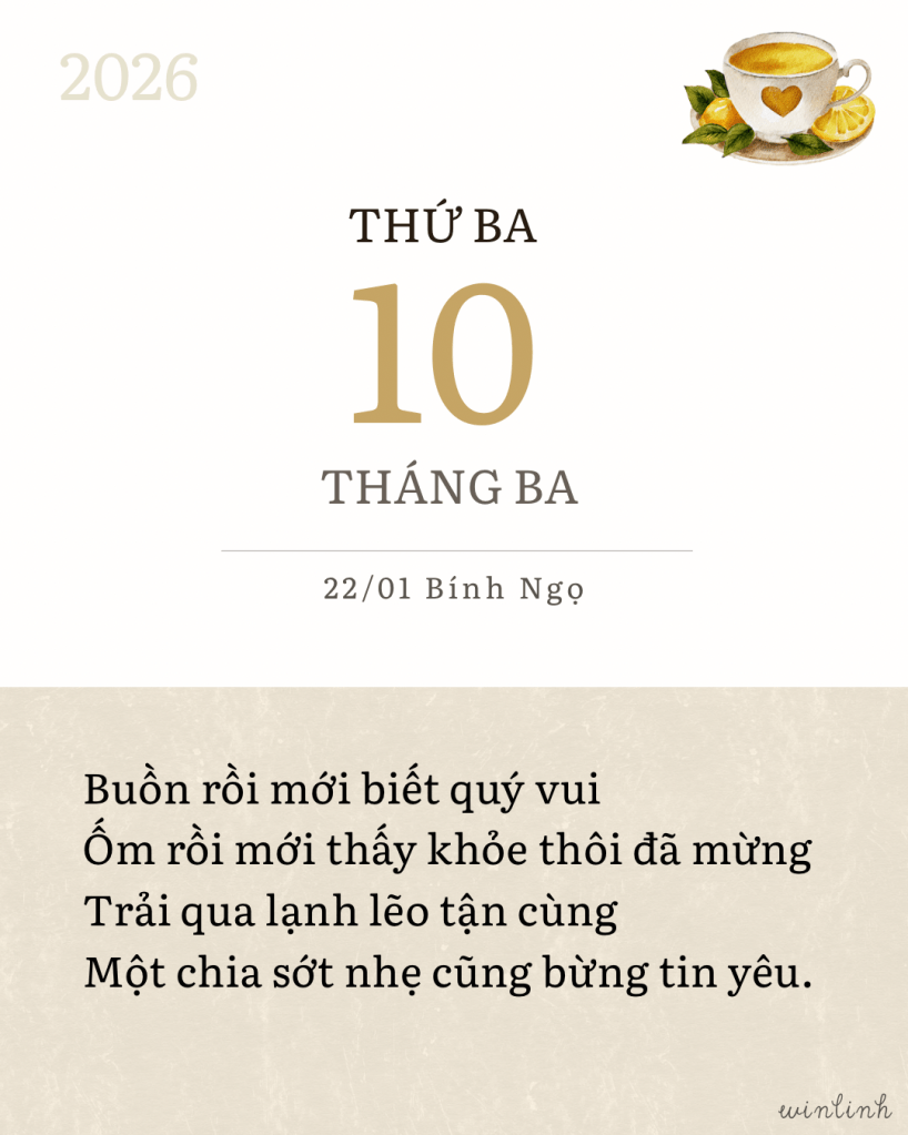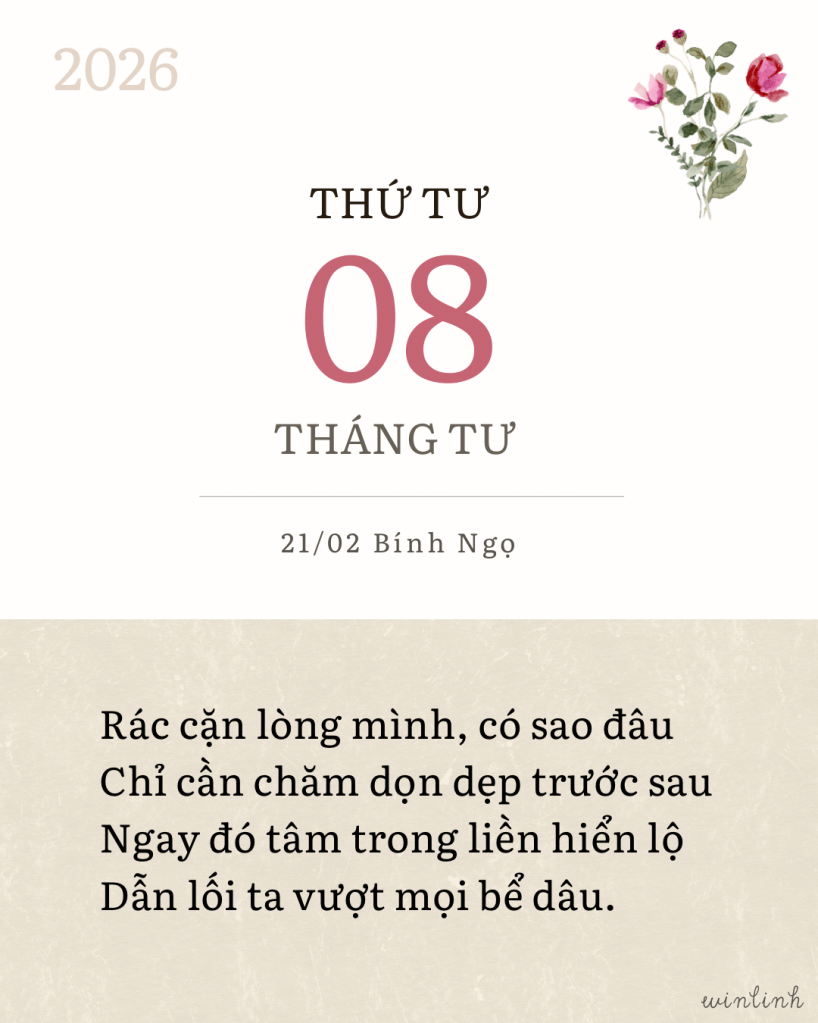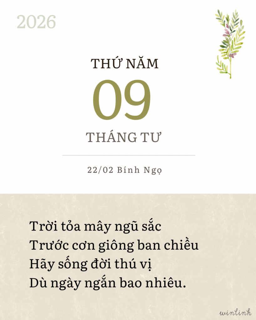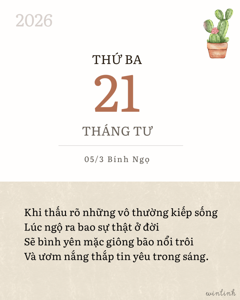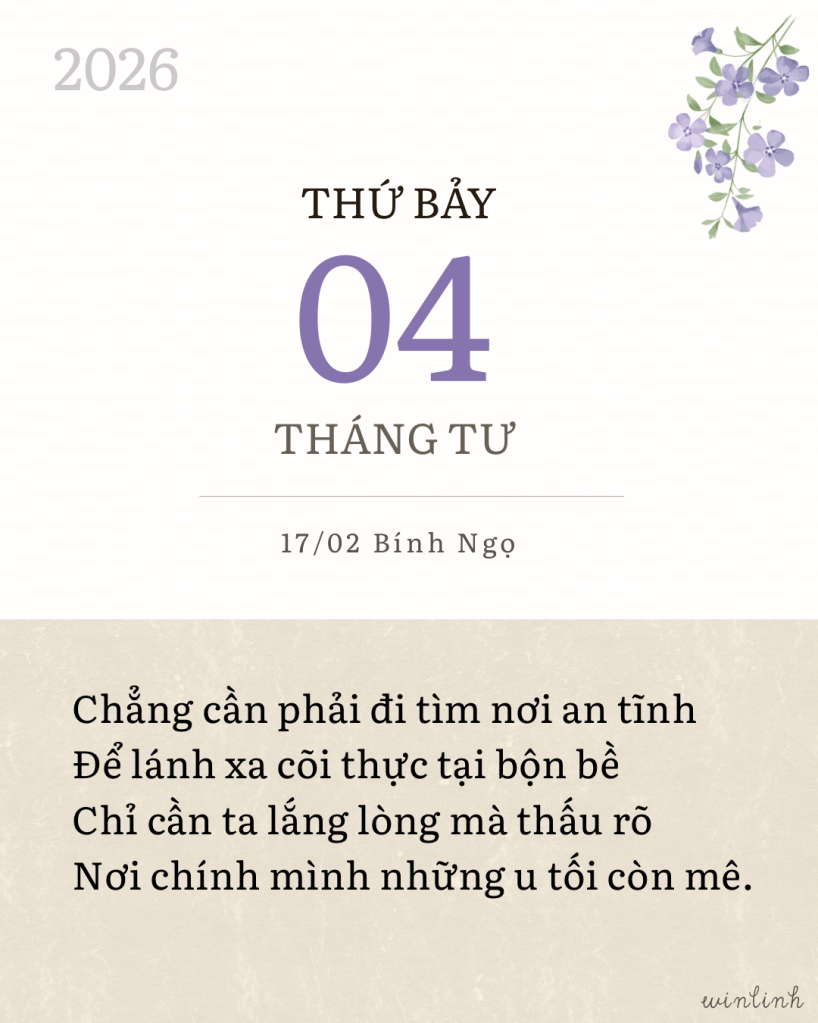 Biết được quy luật đời có lúc đủ đầy thì cũng có khi hao khuyết, ta còn gì phải băn khoăn. Cứ tận hưởng nỗi cô đơn, để được lắng lại mà cảm nhận sâu hơn mọi điều, được trở về trọn vẹn với chính mình trong nỗi buồn ban sơ nguyên thủy. Một chút thôi, lặng lẽ hiếm lời, đủ cho mình biết nâng niu quá khứ, trân trọng hiện tại và yêu dấu ngày mai.