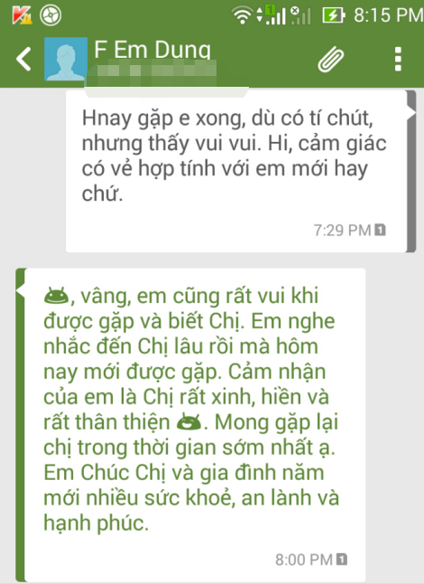 Giữa những buồn phiền đó, tôi bỗng gặp nụ cười em, như một vệt nắng mai trong trẻo. Em, một cô bé trông rất cá tính và vô cùng có duyên, một cô em cùng tên và tôi nghĩ là sống rất được. Em nhắn cho tôi cái tin trong đó có một từ cực kỳ ưu ái mà hình như chưa ai nói với tôi bao giờ. Có lẽ ánh sáng lấp lánh mờ ảo và hương bia đượm thấm trong mắt em đã khiến em nhìn tôi ra như vậy. Dù sao cũng có chút ấm áp nhè nhẹ xen giữa một ngày kết thúc bằng vị đắng. Nhớ thế chiếc dây da đã gắn bó với cổ tay mình bao lâu nay. Có lẽ sẽ không bao giờ gặp lại. Ngủ ngoan và cho tao xin lỗi, mày nhé!