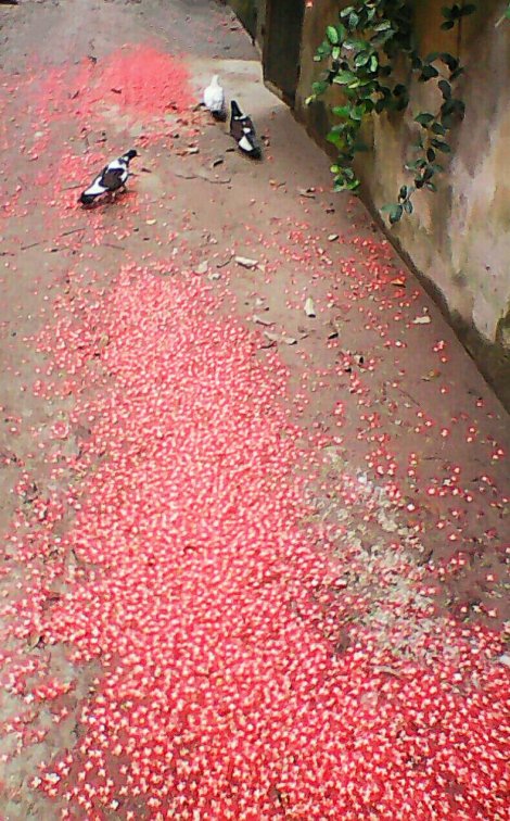 Hoa rụng đỏ lối và chim bồ câu thơ thẩn, là hình ảnh tôi gặp mỗi sáng khi bước chân ra cửa đi làm.