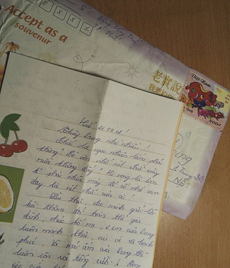 Thư của Hồng Nhung từ Huế gửi ra cho mình năm 2007. Nhung là bạn cấp 3 của mình, cùng học chung lớp C1 trường THCB Đào Duy Từ và thường gọi mình là “tình yêu không bao giờ cưới”. Nhung vô SG sau khi tốt nghiệp Đại học ở Lâm Đồng. Cuộc sống bạn còn nhiều khó khăn nhưng tôi không giúp được gì ngoài việc chia sẻ, động viên về tinh thần. Chúng mình cứ song hành với nhau như vậy, cũng rất lâu mới gặp nhau một lần, nhưng mối quan hệ thì chẳng có gì thay đổi cả.
