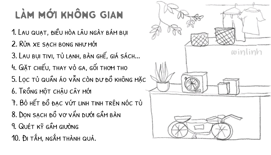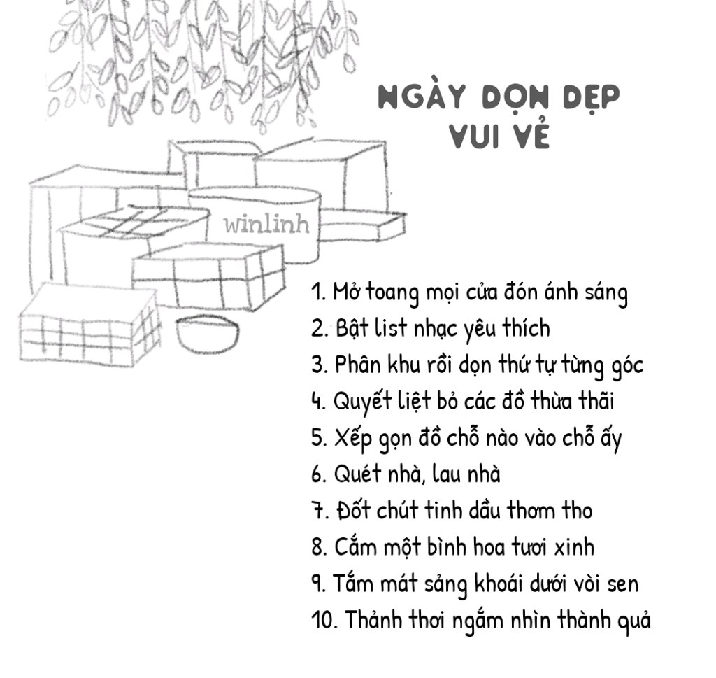 Tôi thích cuối tuần vì tôi được nhẩn nha dọn dẹp nhà cửa. Bởi tôi xem việc dọn dẹp là niềm yêu thích, nên khi dọn nhà tôi thấy rất thư giãn. Mỗi khi bỏ được thứ gì đi tôi thấy người lại thêm nhẹ bỗng và khoan khoái. Sau khi dọn dẹp xong, tắm gội sạch sẽ, nhìn ngắm không gian tĩnh lặng và tươi mới, cảm thấy thư thái vô cùng.