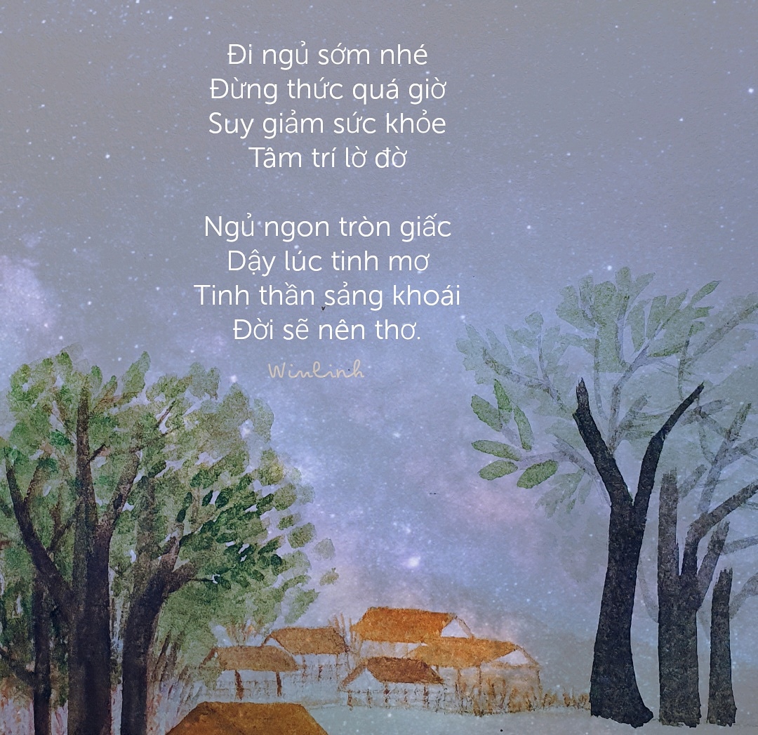 Vừa vẽ rồi viết một bài thơ ngắn xíu dặn mọi người đi ngủ sớm, mà giờ mình còn lọ mọ chưa lên giường. Ngủ ngay và luôn nào bạn Winlinh! Chúc mọi người ngủ ngon nhé!