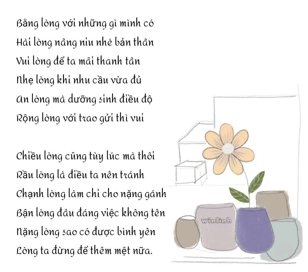 4. Nhu cầu thực sự của ta ít lắm. Chỉ có yêu cầu của con mắt người đời dành cho ta mới nhiều mà thôi. “Những con mắt trần gian” đôi khi đưa ra đòi hỏi vô cùng với đánh giá, phán xét phiến diện và thiếu bao dung. Tuy nhiên, có hay không có những mắt nhìn đó, ta vẫn sẽ hạnh phúc nếu ta biết hài lòng. Mỗi người đều có điều kiện, hoàn cảnh, nhu cầu và tiêu chí sống khác nhau, nên không thể đem thước của người này đo vào đời người khác. Nếu cứ chạy theo đòi hỏi của bên ngoài, ta sẽ mệt nhoài và kiệt sức trong sự ngu muội của chính mình.