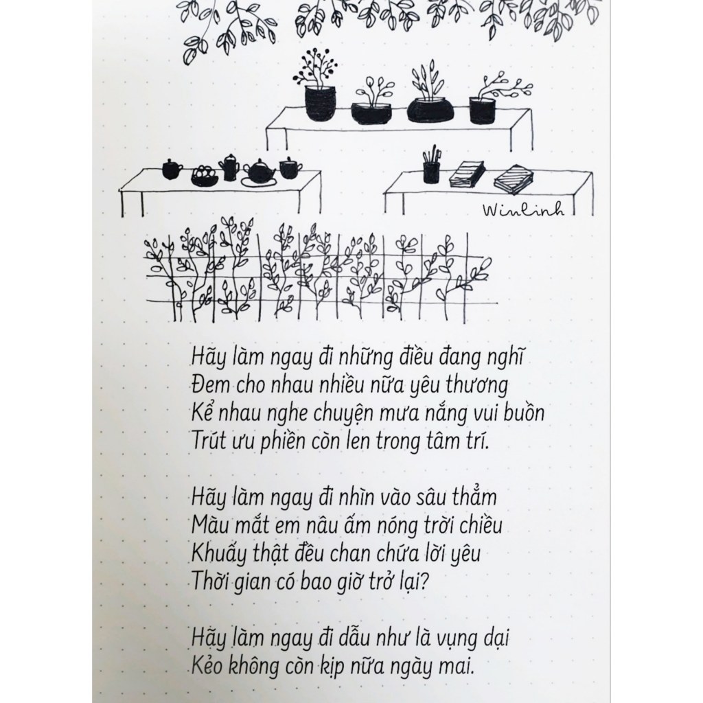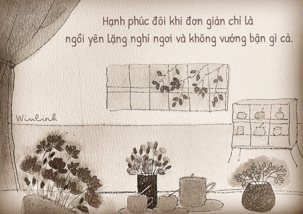 1. Một khoảng tĩnh lặng trong ngày có cần thiết với bạn? Còn tôi, tôi thường dành ít nhất một giờ đồng hồ trong ngày cho “một mình”. Lúc này, tôi ngồi ở bàn làm việc, làm gì tôi muốn (vẽ, viết, hát, đọc, ghi chép chi tiêu/kế hoạch). Một giờ đồng hồ sẽ giúp tôi sắp xếp mọi thứ vào trật tự. Cũng có lúc tôi không làm gì, chỉ ngồi yên, nhưng cảm nhận được nguồn năng lượng mới dội về sau khoảng lặng cần thiết ấy. Với tôi, tĩnh lặng là một giá trị, mà trong bầu không khí đó, tôi được truyền cảm hứng để tạo nên những giá trị nhỏ bé khác của riêng tôi.