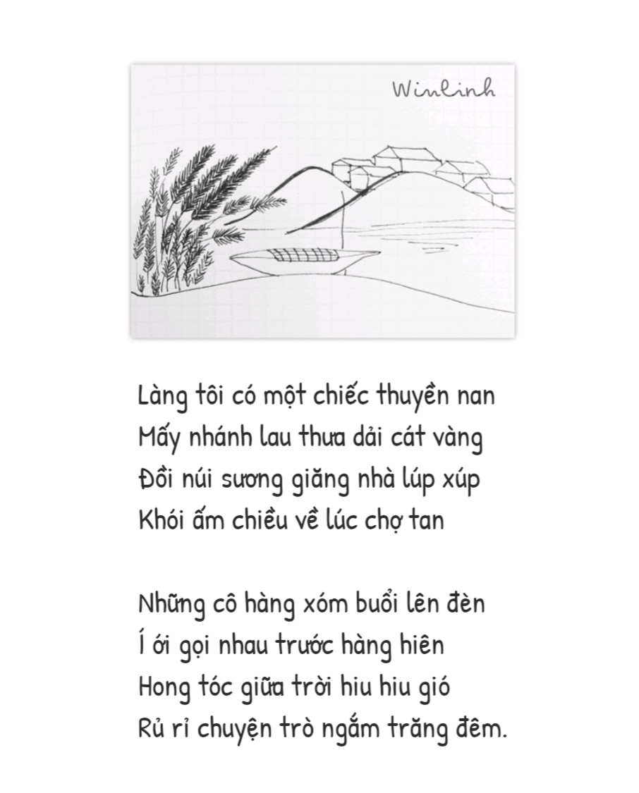 3. Tôi thích từ “nhà quê”, một từ gợi nhiều gần gũi và thân thuộc. Bao năm qua, nét vẽ của tôi về nhà quê vẫn cứ vụng về trẻ con như thế. Có phải vì quê hương như mẹ hiền, nên ta luôn là đứa trẻ nhỏ dù có bao nhiêu tuổi đi nữa? Nhà quê trong tranh tôi đơn thuần, lặp lại với những cây dừa cây cau bụi chuối, bờ ao cầu tre giếng nước, con mèo con gà con vịt, nón lá chum vại đụn rơm… Tôi vẽ nhà quê không biết chán và không thiết lớn. Tôi nhìn làng quê bằng con mắt chưa trưởng thành, nên cứ trẻ thơ mãi trong nét vẽ quê hương.