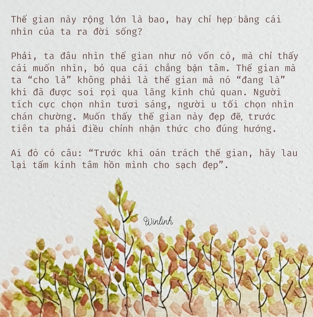 Hôm nay tôi lại ra hành lang ngắm mấy cây phượng bên trường học đối diện chỗ làm. Cây phượng lá xanh mướt, sạch tinh đu đưa cành trong gió thu. Nếu mỗi ngày cứ dành ra ít phút ngắm cây, thì mắt sẽ trong sáng hơn, tâm hồn cũng thư thái hơn ấy nhỉ. Nên mai tôi sẽ lại ra ngắm cây tiếp nhé!.