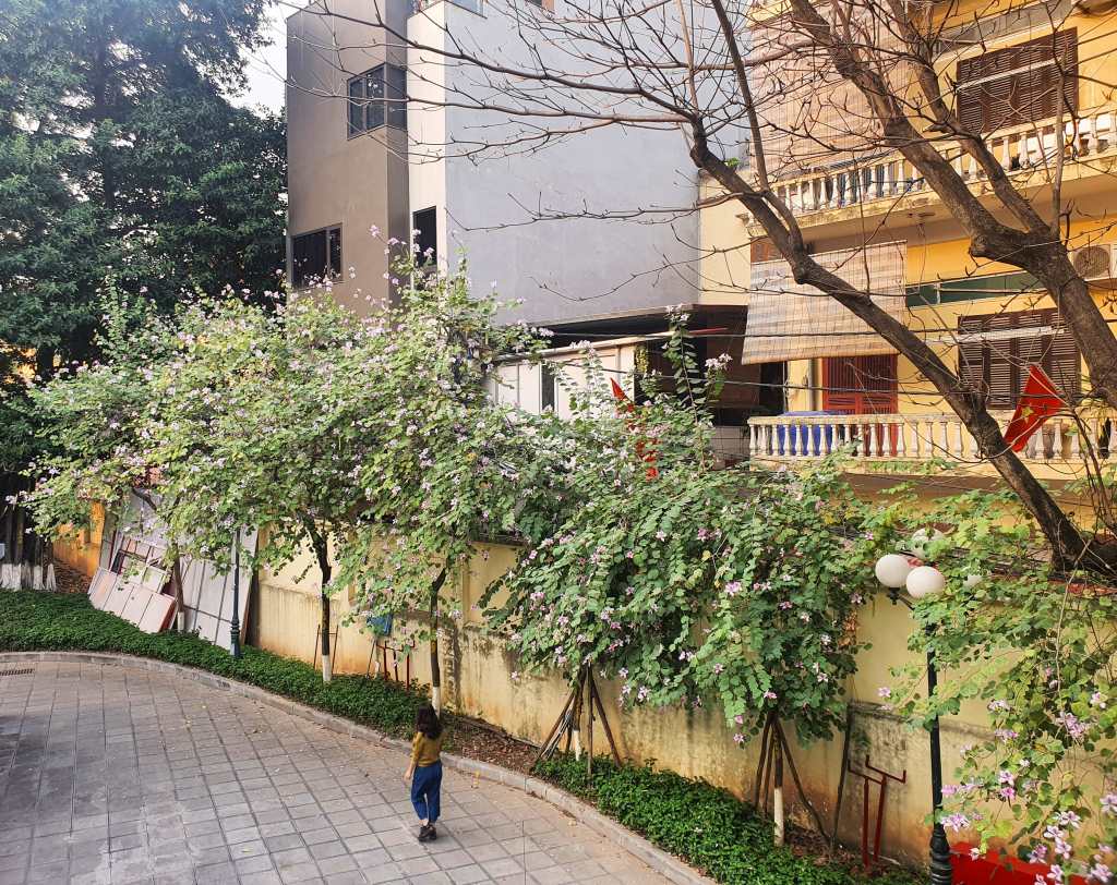 Chiều tan làm, tôi đứng ngắm hàng cây hoa ban tím nở trong yên lặng.