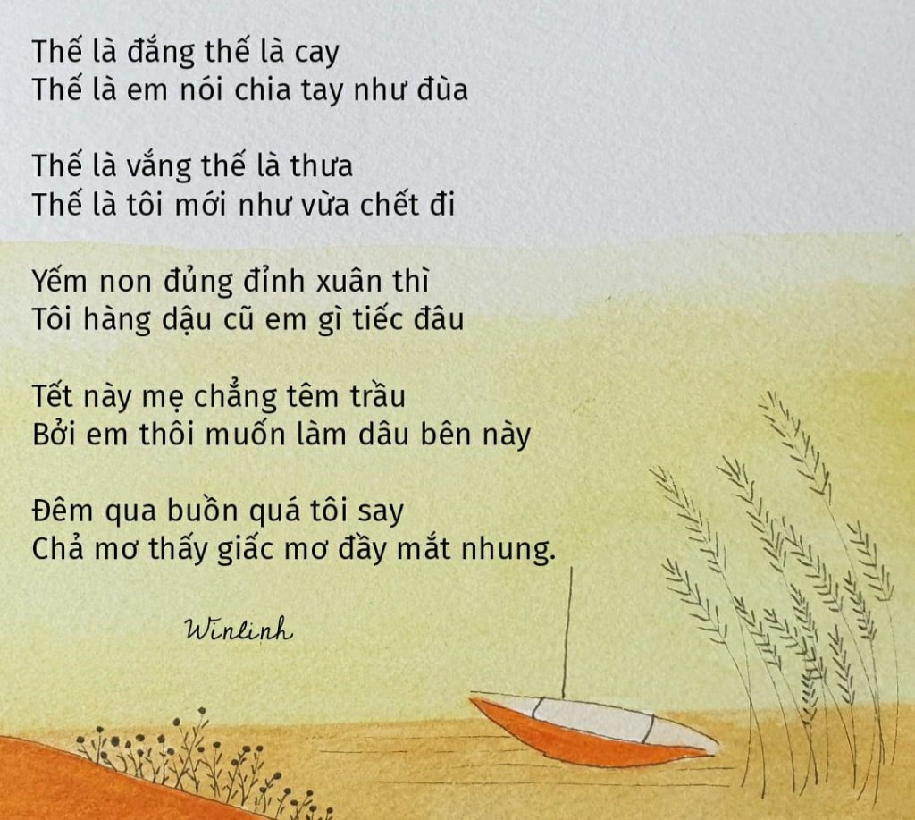 Tôi rất mê thơ Nguyễn Bính, ngày xưa còn mua cả tuyển tập thơ ông và ôm ấp đọc thường xuyên. Sau này tôi cũng có một số bài ảnh hưởng hơi thở thơ Nguyễn Bính là vậy. Thậm chí bài thơ sau tôi còn dựa trên hai câu của ông trong bài “Mắt nhung” để ra cái kết.