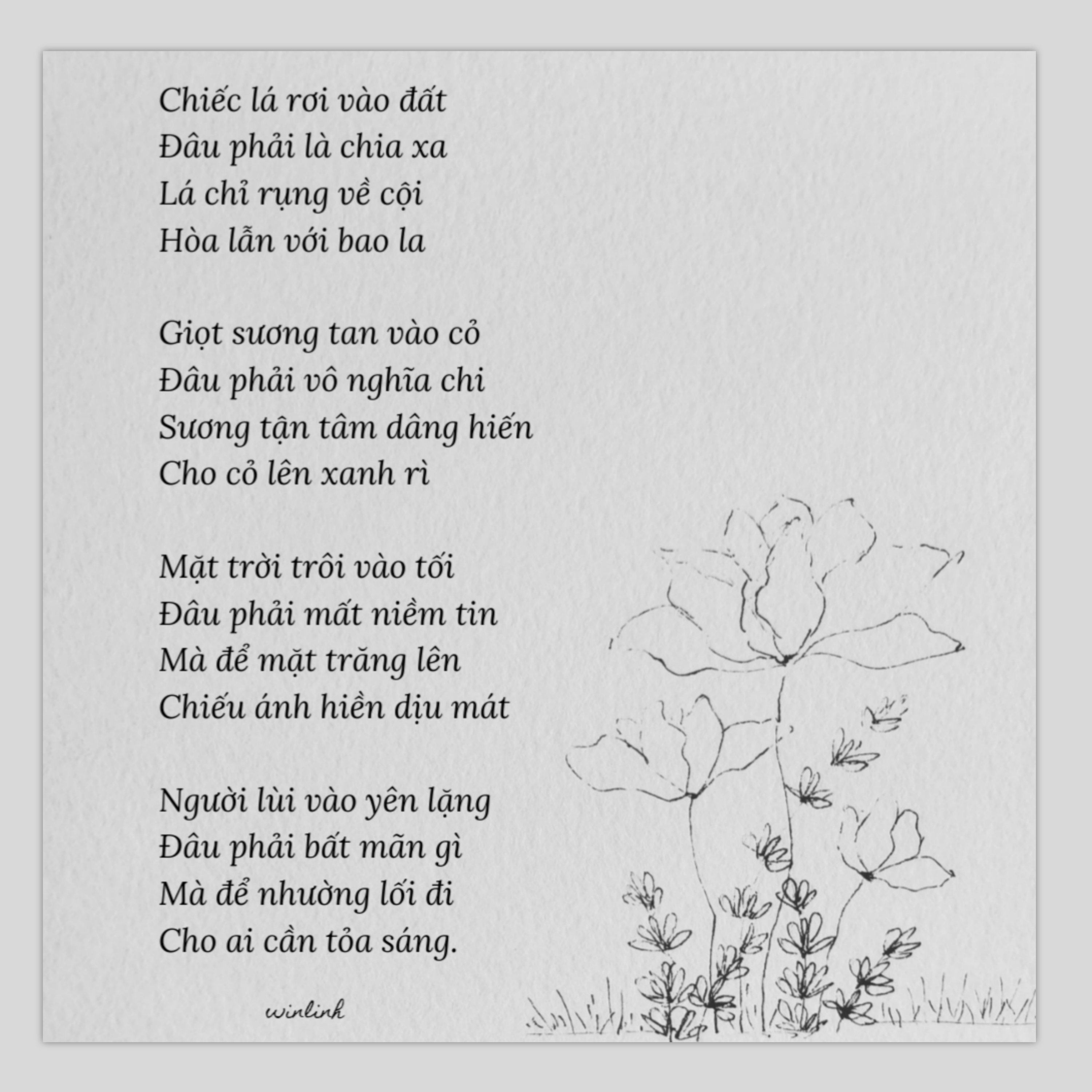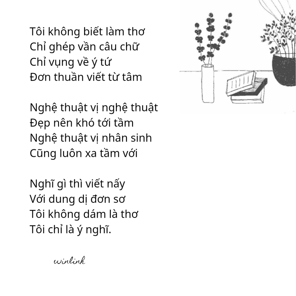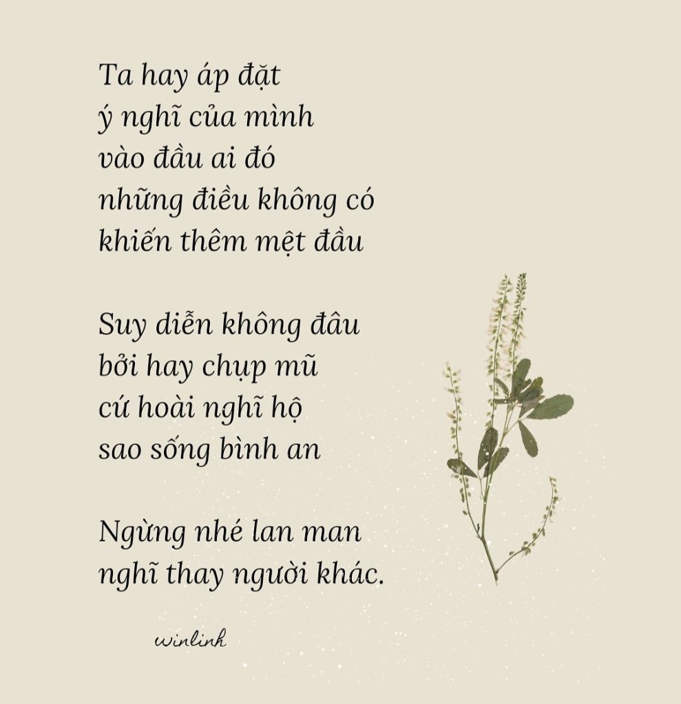 Đây là bài tôi viết trên page Winlinh từ 5/11/2020, nay nhân đọc được một bài có nội dung tương tự của một bạn trong blog, tôi chợt nhớ ra nên tìm bài cũ up lên đây để lưu lại. Sau thời điểm viết bài này, đôi khi tôi vẫn gặp những trường hợp bê thơ mình đi mà cố tình không để nguồn. Nhưng dần dần, tôi buộc phải học cách quen với điều đó và tự nhủ, chữ của mình vẫn mãi là của mình. Ai đó mượn dùng mà cố tình biến thành của họ thì nó vẫn luôn chỉ là cái vay mượn, ăn cắp mà thôi.