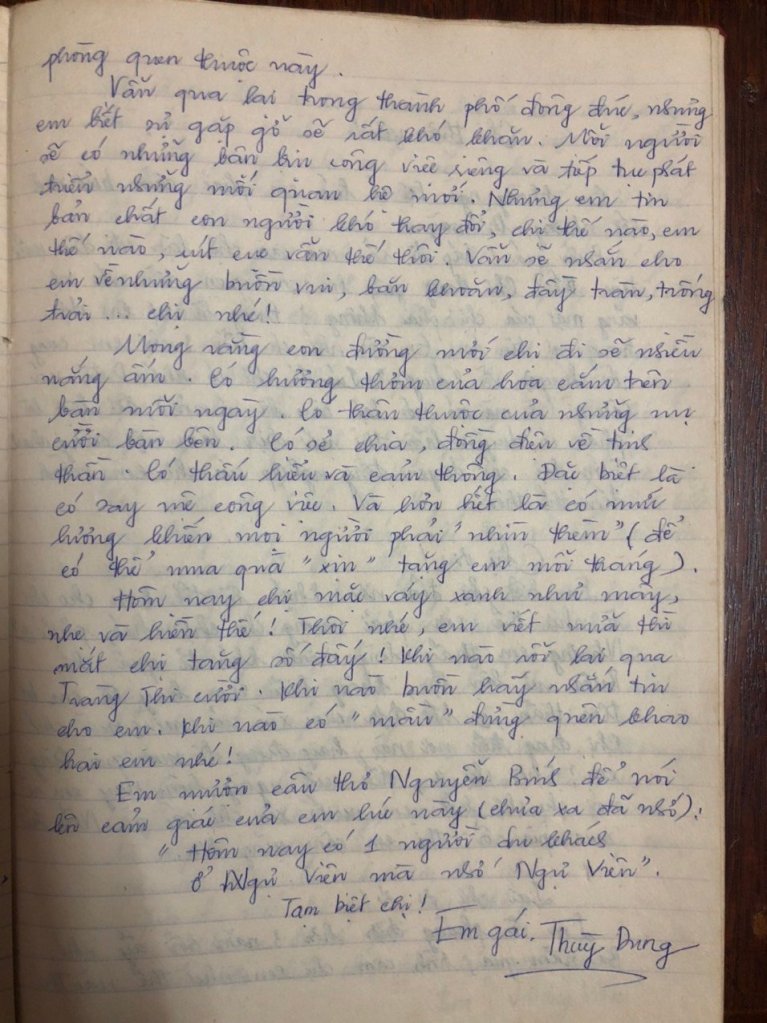 Tối qua chị Mỹ gửi hai bức ảnh chụp lưu bút mình viết cho chị trước khi chị chuyển công tác. Đúng là có rất nhiều điều ta không thể nhớ cho đến khi được đọc lại, xem lại, nghe lại. 14 năm rồi, thời gian nhanh quá! Thật vui vì chị em ta vẫn ở đây, gần nhau. Chị còn vừa lập group cho ba chị em (cả chị Vân) để chúng mình cùng ôn lại bao kỷ niệm. Các chị của em vẫn rất trẻ và như vậy em không có lý gì mà không trẻ theo, em là em út cơ mà. À nhân tiện, mình thích viết trên mấy cuốn sổ có giấy kiểu này, khi viết chữ trôi ra dịu dàng lắm!