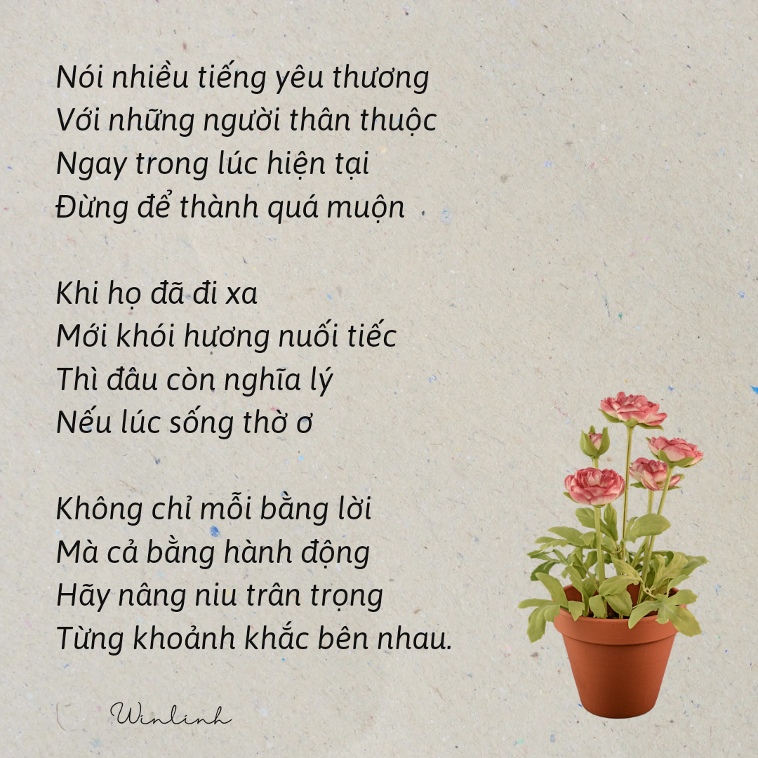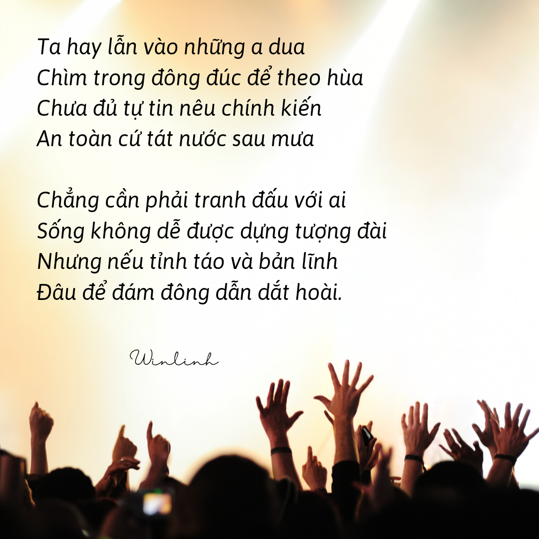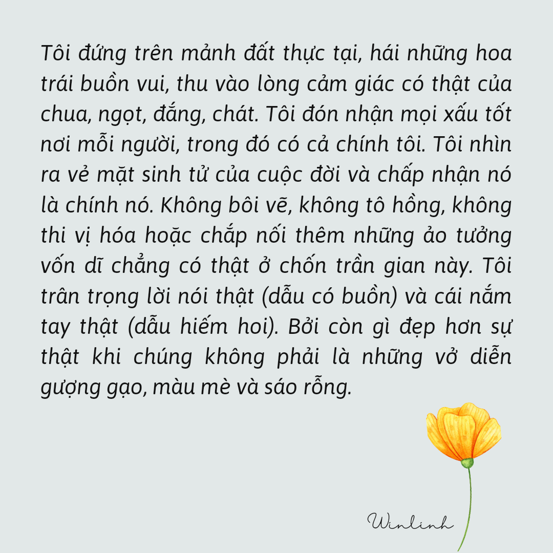 Hay có lúc buồn vì thiếu tiền thiếu nợ. Có lúc lại buồn vì làm không được việc gì nên hồn. Buồn vì tóc bạc nhiều hay vì diện mạo dạo này xuống cấp… Ôi những cái buồn li ta li ti không đếm xuể. Nhưng thật sự thì mình đã đủ nhận thức để hiểu rằng “nỗi buồn nào rồi cũng qua đi”. Và tất cả luôn là thời điểm. Lúc này thế, lúc sau khác. Nên “điềm nhiên đón nhận, mọi chuyện xảy ra” bởi “đời cho ta thế, cứ vui thôi mà” (thơ Winlinh).