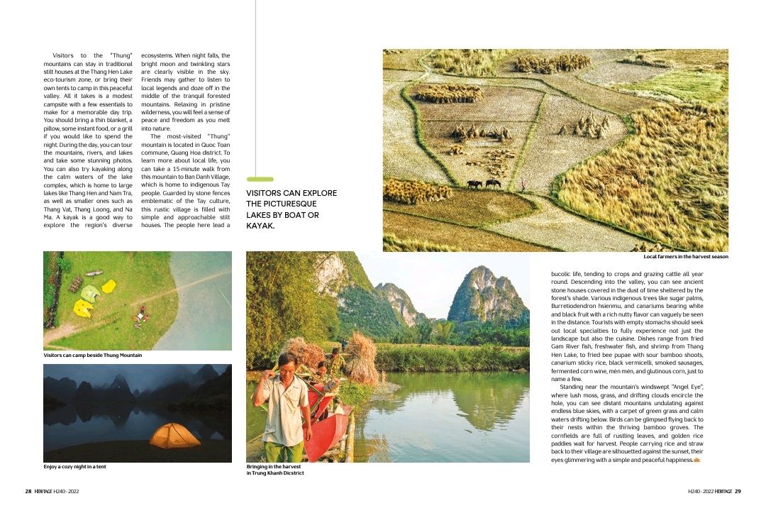 Có những ngọn núi thủng nằm cách không xa quần thể hồ Thang Hen với 36 hồ nước ngọt tự nhiên thông nhau bởi các hang động ngầm dưới lòng đất. Chính điều này đã khiến hồ Thang Hen có hiện tượng mực nước thay đổi theo mùa, thậm chí theo ngày khi có lúc nước rút rất đột ngột chỉ trong vài tiếng. Đây được xem là hồ nước ngọt trên núi cao và đẹp nhất ở Việt Nam, được bao quanh bởi những tán rừng xum xuê xen lẫn những mỏm đá tai mèo màu xám. Ghé thăm Thang Hen vào mùa xuân bạn sẽ được ngắm cây cối, cảnh vật rạng rỡ với trăm hoa rực rỡ, rất thích hợp để ngồi thuyền du ngoạn, ngắm cảnh. Nếu đến nơi đây vào mùa hè, bạn sẽ được hưởng bầu không khí trong lành với cây cối hai bên hồ trổ lá xanh tươi. Vào mùa mưa, nước hồ dâng cao do mưa nhiều tạo thành chuỗi 36 hồ nước mênh mông trải dài. Mặt hồ như tấm gương trong cho những ngọn núi xám cúi mình soi bóng. Vịt bơi thảnh thơi giữa dòng nước lặng và trên bờ trâu bò thong dong gặm cỏ. Vào mùa khô, hai bên hồ vàng ươm sắc lá và càng nên thơ hơn khi hoa dã quỳ đã bung mình nở rộ. Lúc này, nước hồ cạn đi để lại lớp bùn non làm nền cho cỏ mọc lún phún xanh biếc trên mặt hồ. Nước rút đến mức người dân nơi đây còn lội xuống lòng hồ bắt được rất nhiều cá. Trong quần thể hồ Thang Hen còn có thác Nặm Trá rộng 15 ha. Thác không cao nhưng có rất nhiều dòng chảy uốn lượn xen giữa những mỏm đá cao thấp lô nhô, dào dạt tuôn về mặt hồ Nậm Trá như những dải lụa mềm dài vô tận.
