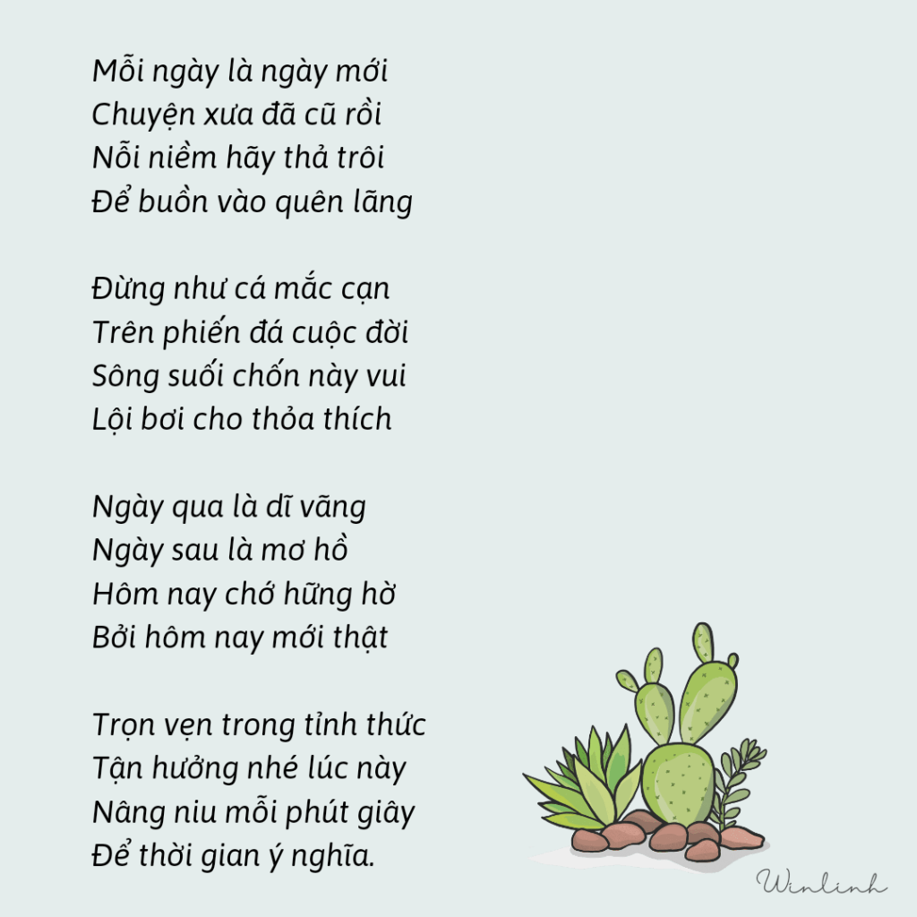 Đăng bài lên mạng là để thể hiện tình yêu, sự mở lòng với cuộc đời mà đôi khi chỉ cần chính mình cảm nhận là đủ. Như thế dù có một, hai like cũng có gì phải nản. (Như page Winlinh, trước có nhiều bài mấy nghìn, mười mấy, hai mươi mấy nghìn like, giờ còn vài trăm like, có sao, tôi vẫn sáng tác và đăng bài mỗi ngày. Nếu nhìn like để sống thì đam mê đã chẳng thật sự là đam mê).