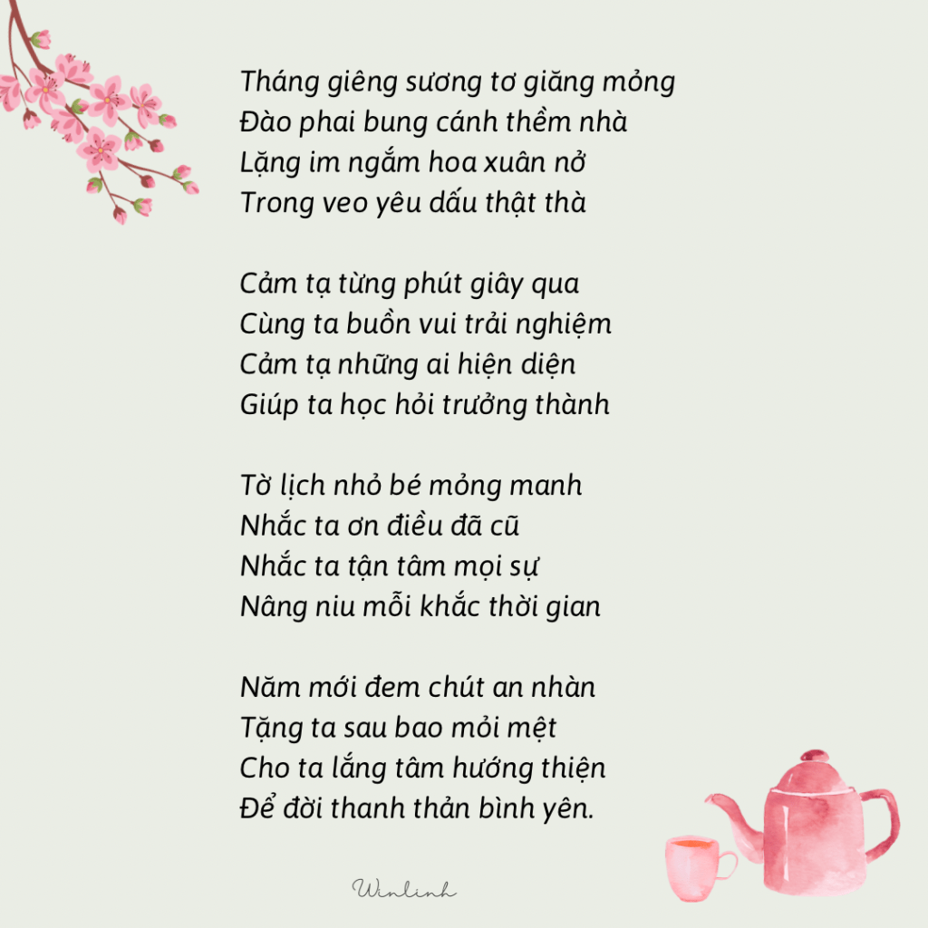 Ngày mùng 1 với mình quá đỗi bình yên và mình thích như vậy. Sáng dậy đem hai chậu hoa đồng tiền nhỏ ra cửa sổ đón ánh nắng dịu trong tiết trời hiu hiu lạnh. Rồi mình pha trà uống và dọn dẹp nhà cửa. Đáng ra phải dọn từ trước đó nhưng suốt mấy ngày cứ bận việc nên còn những chỗ chưa kịp gọn gàng. Dọn sơ sơ xong mình đi phơi phóng quần áo và lại dọn tiếp. Buổi chiều nằm mãi mới ngủ một tí vì trước khi ngủ còn mải làm… thơ. Tối đến còn dọn mải mê một hồi rồi đi tắm xong thì viết mấy dòng này.