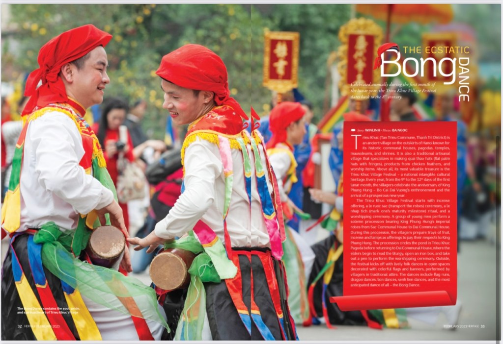 Múa bồng có tên dân gian là “Con đĩ đánh bồng”, là điểm nhấn của lễ hội và là niềm tự hào của bà con dân làng Triều Khúc. Tương truyền, vào thế kỷ thứ 8, lúc Bố Cái Đại Vương Phùng Hưng đánh đuổi giặc Đường, ông lại tổ chức cho các binh sĩ giả gái, đeo trống để múa hát nhằm khích lệ tinh thần trước khi vào trận chiến hay khi ăn mừng thắng lợi. Thấy các binh lính giả gái múa bồng rất dẻo giữa tiếng reo hò mừng vui vang rội của nghĩa quân và dân làng, vua Phùng Hưng gọi vui là “con đĩ” (từ “đĩ” khi ấy dùng để chỉ người con trai giả gái chứ không mang nghĩa tiêu cực nào). Nét đặc biệt của điệu múa này ở chỗ vũ công là những nam thanh niên chưa lập gia đình, có diện mạo ưa nhìn, xuất thân từ các gia đình gia giáo trong làng. Các chàng trai được tô son thoa phấn, môi đỏ má hồng, mặc váy đụp hay quần nhiễu đen, vai khoác tấm lụa đào thêu họa tiết công phượng có viền tua rua rủ xuống, đầu chít khăn mỏ quạ. Trước bụng mỗi người là chiếc trống bồng nhỏ sơn màu đỏ và được cố định bằng dải lụa đỏ buộc khéo léo phía sau lưng.