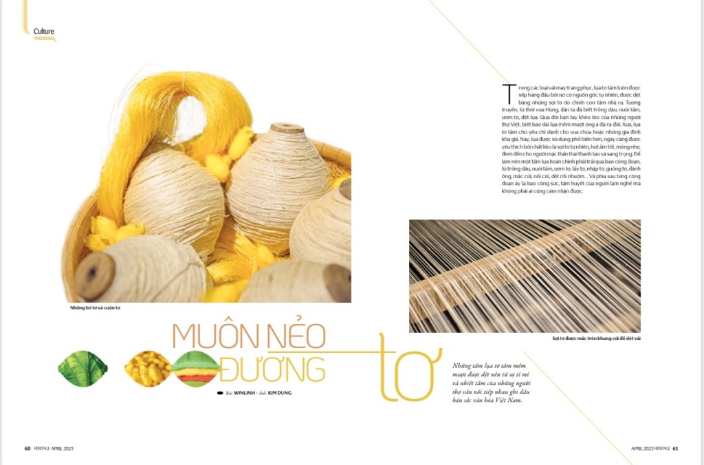 Tương truyền, từ thời Vua Hùng, dân ta đã biết trồng dâu, nuôi tằm, ươm tơ, dệt lụa. Qua đôi bàn tay khéo léo của những người thợ Việt, biết bao dải lụa mềm mượt óng ả đã ra đời và tỏa đi muôn nẻo. Xưa, lụa tơ tằm chủ yếu chỉ dành cho vua chúa hoặc những gia đình khá giả bởi giá thành cao. Nay, lụa được sử dụng phổ biến hơn, song chúng không bị nhòa lẫn bởi đặc thù chất liệu là sợi tơ tự nhiên, hút ẩm tốt, mỏng nhẹ, đem đến cho người mặc thần thái thanh tao và sang trọng. Để làm nên một tấm lụa hoàn chỉnh, người thợ phải trải qua biết bao công đoạn, từ trồng dâu, nuôi tằm, ươm tơ, lấy tơ, nhập tơ, guồng tơ, đánh ống, mắc cửi, nối cửi, dệt rồi nhuộm… Và phía sau từng công đoạn ấy là bao công sức, tâm huyết của người làm nghề mà không phải ai cũng cảm nhận được.