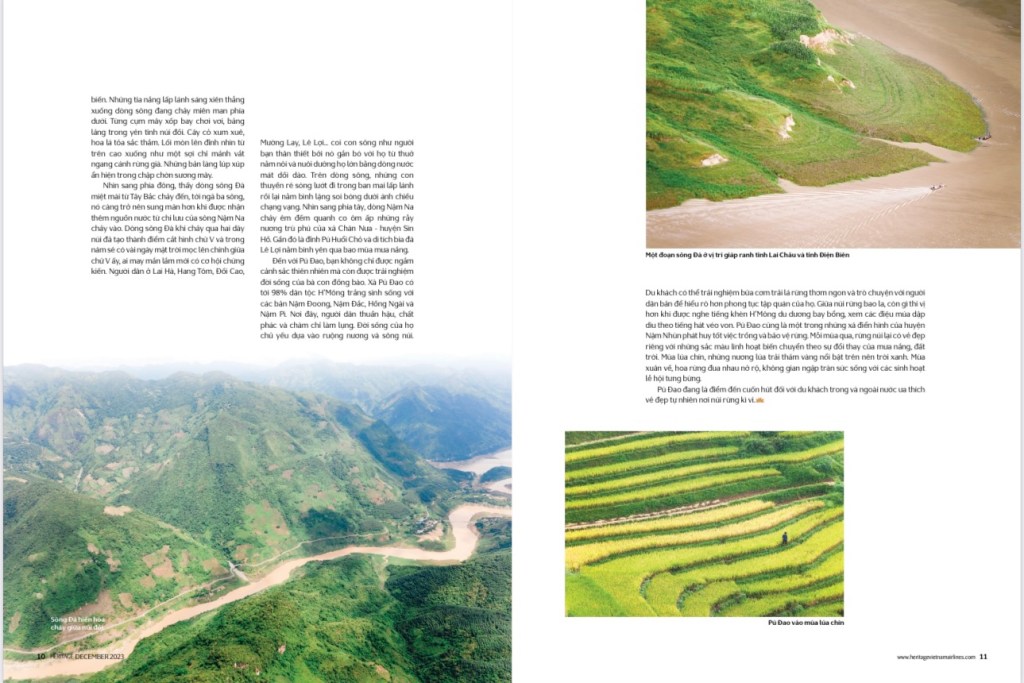 Nhìn sang phía đông, thấy dòng sông Đà miệt mài từ Tây Bắc chảy đến, tới ngã ba sông, nó càng trở nên sung mãn hơn khi được nhận thêm nguồn nước từ chi lưu của sông Nậm Na chảy vào. Dòng sông Đà khi chảy qua hai dãy núi đã tạo thành điểm cắt hình chữ V và trong năm sẽ có vài ngày mặt trời mọc lên chính giữa chữ V ấy, ai may mắn lắm mới có cơ hội chứng kiến. Người dân ở Lai Hà, Hang Tôm, Đồi Cao, Mường Lay, Lê Lợi… coi con sông như người bạn thân thiết bởi nó gắn bó với họ từ thủa nằm nôi và nuôi dưỡng họ lớn bằng dòng nước mát dồi dào. Trên dòng sông, những con thuyền rẽ sóng lướt đi trong ban mai lấp lánh rồi lại nằm bình lặng soi bóng dưới ánh chiều chạng vạng. Nhìn sang phía tây, dòng Nậm Na chảy êm đềm quanh co ôm ấp những rẫy nương trù phú của xã Chăn Nưa – huyện Sìn Hồ. Gần đó là đỉnh Pú Huổi Chỏ và di tích bia đá Lê Lợi nằm bình yên qua bao mùa mưa nắng. Điểm thú vị là khi kết thúc chặng hành trình, du khách sẽ đi theo hướng bắc để xuyên rừng sang phía xã Nậm Hàng (giáp 2 xã Lê Lợi và Pú Đao) chứ không quay về điểm xuất phát ban đầu.