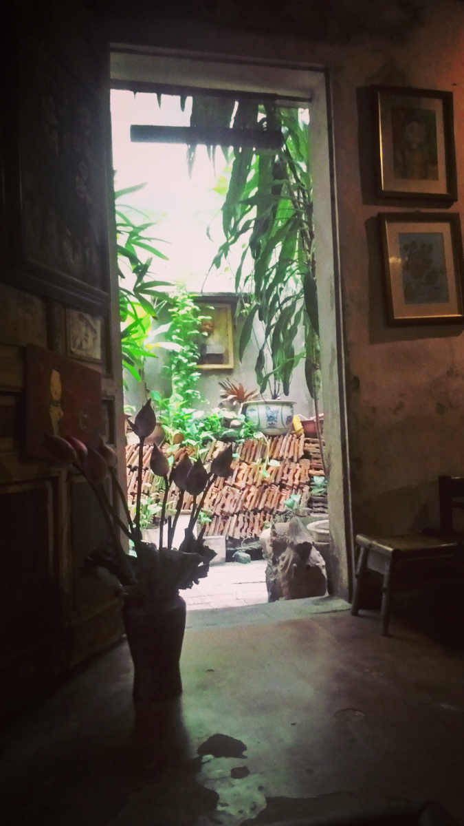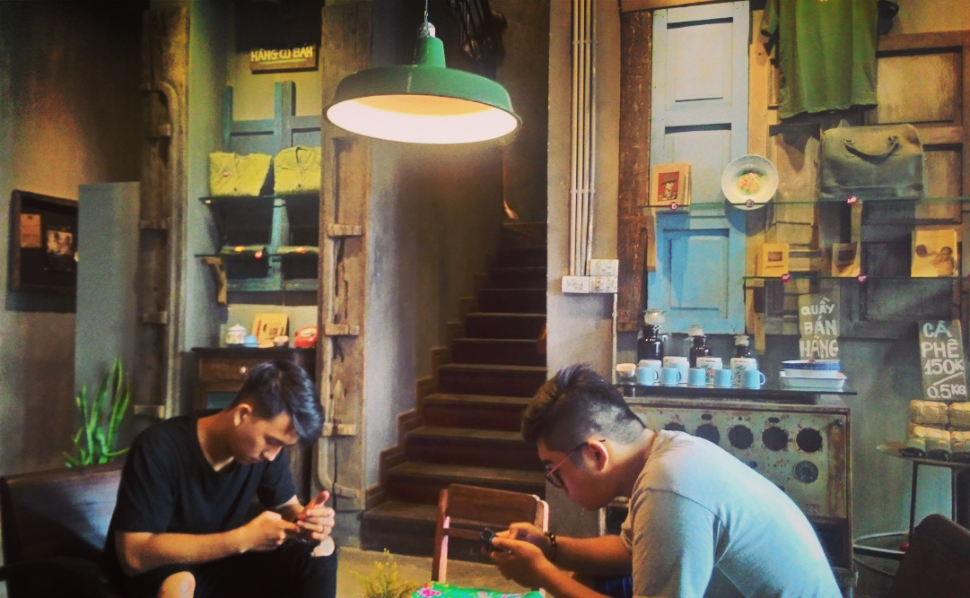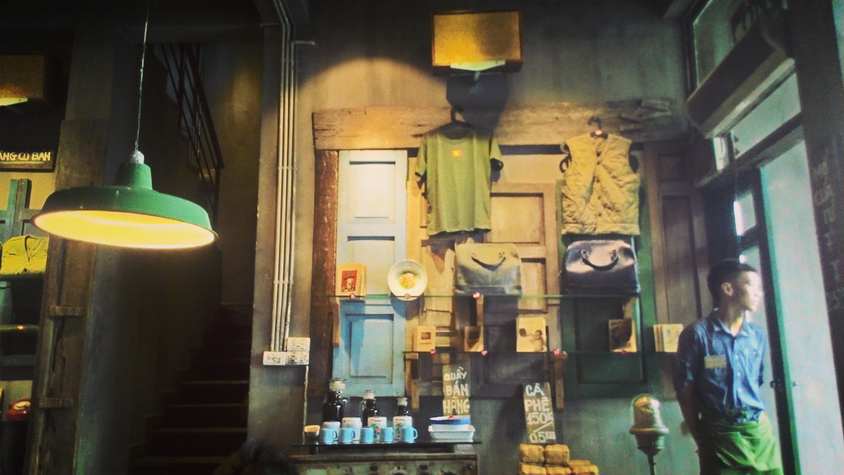 Ngồi trên quán cà phê hàng Bún, có thể nhìn xuống đường qua khoảng lan can nhỏ nhắn. Phía trên đầu treo một giỏ hoa nhựa thật cũ, gió thỉnh thoảng đu qua đu lại đung đưa. Phía trong, những ký ức cựa quậy nhè nhẹ. Là những đồ vật xưa cũ đã lên nước thời gian. Hai chú mèo ngoan nằm cuộn mình trên ghế gỗ đón tiếng nhạc không lời buông đều đặn bên những chiếc bàn chế tác từ những chiếc máy khâu. Những chiếc xe đạp cũ tựa vào nhau như còn chờ chủ nhân dắt ra sân và đạp đi đâu đó…