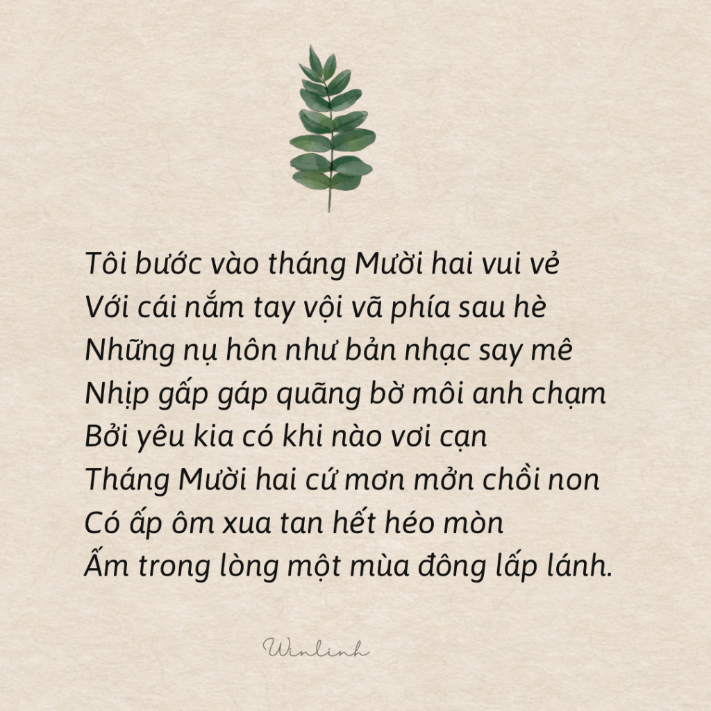 Tôi thương tháng Tám nắng vàng Và thương mấy tán lá bàng mộng mơ Tôi thương góc phố nên thơ Và thương thêm nỗi đợi chờ dịu êm Tôi thương hoa nở bên thềm Và thương gió nhẹ thổi mềm bờ vai Tôi thương những nỗi buồn dài Và thương cả chút tàn phai cuối mùa.