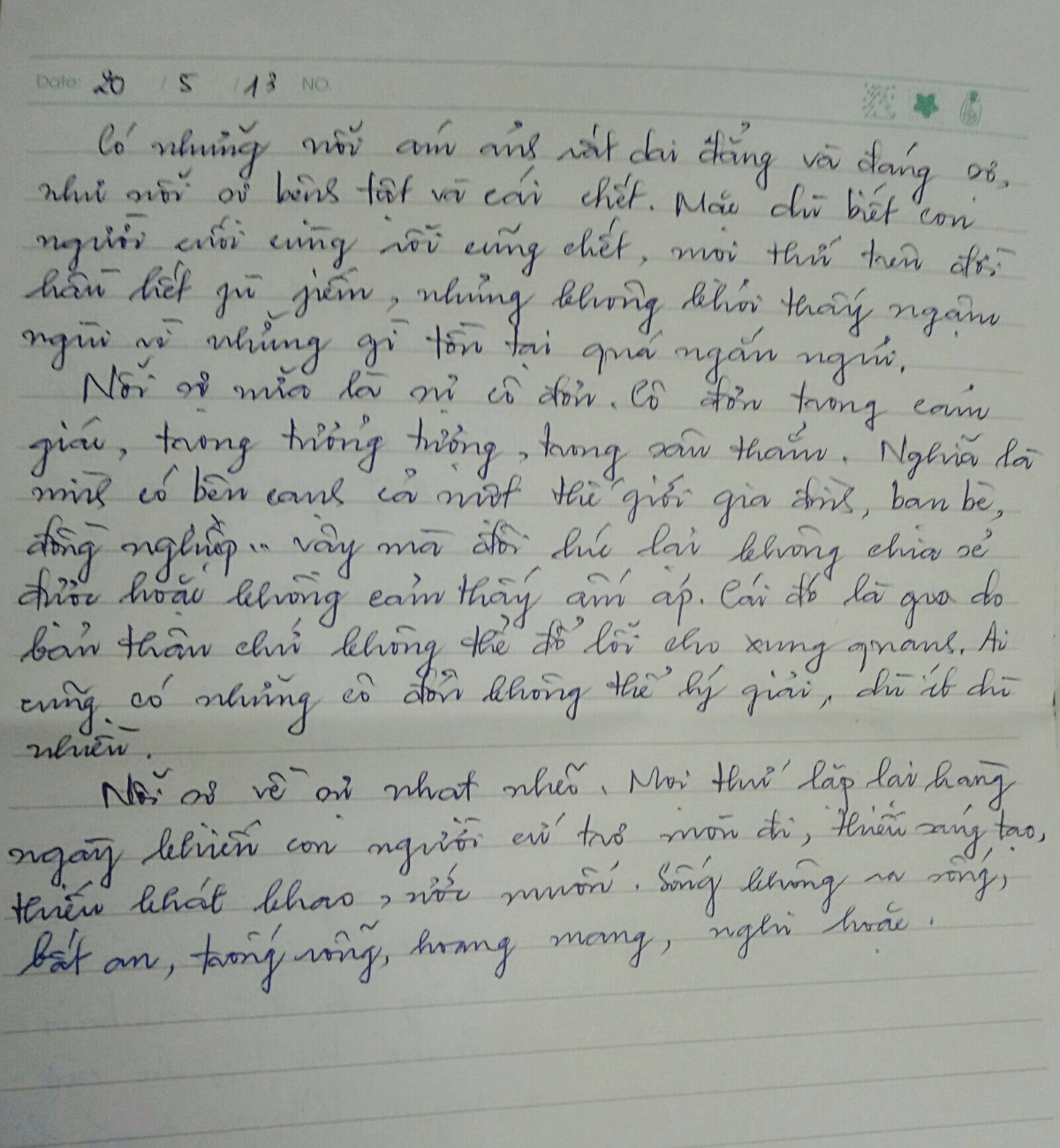 Nhung nhắn tin qua zalo nói “dỗi”, “gato” với tôi,… nhưng tôi lại thấy ấm áp vì hiểu trong lòng Nhung tôi vẫn có chút ý nghĩa nào đó. Đọc những gì Nhung viết cho tôi và Nga, thương yêu. Đừng bao giờ nghĩ tôi lãng quên hay Nhung không có vị trí trong lòng tôi. Với tôi, trong những người bạn không – ai – thay – thế – được, luôn có Nhung!